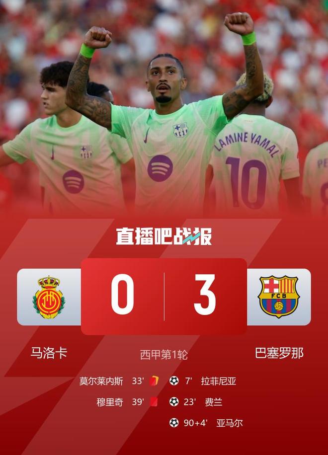 在8月17日的8月17日实时广播的Laliga的第一轮中,巴塞罗那将访问伊比利亚之星,挑战马洛卡。在上半场,雅马尔首先帮助拉菲尼亚,菲兰·托雷斯(Phelan Torres)得分很长,毛琳(Maurin)派出了两个黄色和红色,而穆里克(Murrick)在危险时显示了红牌。后来,拉什福德(Rashford)首次亮相,奥尔莫(Olmo)到达了该职位,雅马尔(Yamal)在停止时间录制了一个胜利。最后,巴塞罗那通过以3-0击败马罗卡的联盟开始了一个良好的开始。 [重要的游戏事件]在第7分钟,雅马尔将球右上拿到了,并调整了十字架。拉菲尼亚在背景上伸出了球,并将球带到了顶部。巴塞罗那以1-0领先! ↓在第23分钟,雅马尔挥舞着球并将其射入里面,但落在地面上,但裁判并没有停止比赛。费兰·托雷斯(Ferran Torres)长期以来继续击球,并在LTO Dead Corner中击中了球。法官表明,目标在2-0中有效! ↓在第33分钟,米特尼斯偶然发现了雅马尔,裁判派他送给他,向他展示了比赛的第二个黄色字母,马洛卡(Mallorca)的节奏较低! ↓在第39分钟,马洛卡(Marolka)在长时间的传球中进行了战斗,琼·加西亚(JoanGarcía)攻击,穆里克(Murrick)战斗,举起双腿提到了老头。裁判首先显示了黄牌,然后在用VAR验证后更改了红牌。马洛卡打的不到2! ↓在第94分钟,Yamarn被切割并触发,在死角击中球,巴塞罗那以3-0的比分扩大了其3-0的得分! ↓球并不结实,角度是直的,所以他被守门员拥抱并失去了机会。 ↓在停止时间的上半场,雅马尔从罚球区的前部跑了一段距离,球失去了一点点正确的职位。 ↓在第58分钟,巴塞罗那从右边的十字架上射门,守门员拯救了球,而奥尔莫·拉斯特里特(Ormo Rastrit)是球,在球前,守门员退休以拯救球。 ↓i在第69分钟,拉菲尼亚从右前方获得传球,Ormo继续射击,球击中了比赛。 ↓在第71分钟,拉菲尼亚从右侧击球,导致了罚球区,从遥远的角落推了一点。在第85分钟,巴塞罗那从右边的十字架越过十字架,阿劳乔飞到了罚球区的左侧,射手并击球。在第89分钟,拉什福德摇晃着罚球区的左侧,突然打电话。雅马尔追捕并射门得太直,这使守门员握住球。 [两侧的巧合对齐]