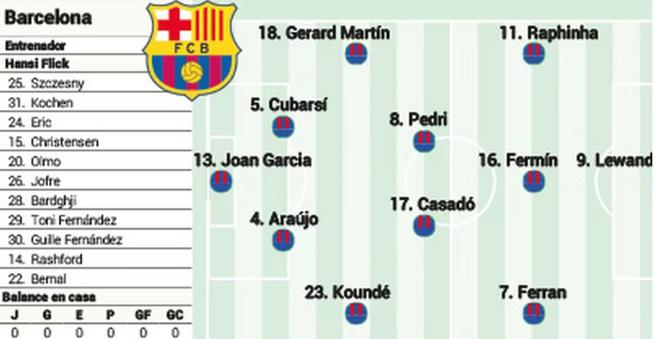 根据屁股的说法,在没有雅马尔的情况下,Flick将需要暂时团结一系列的进攻性偏见,而Lewandowsky可以开始,寻求拉菲尼亚和费兰·托雷斯两岸的帮助。报道说,这部电影必须暂时调整由于对齐中许多人受伤而导致的最初一致性。雅马尔受伤也许是最令人惊讶的雅马尔。罢工者由于受伤很少输掉比赛。但是,这一次,由于耻骨不适和背部问题,雅马尔无法达到好列表。无论如何,电影形成仍然有一个解决方案。最可行的解决方案是发送Ferran Torres。这位前锋状况良好,自德国教练抵达以来,他已经证明了他的所有力量。菲兰在正确的开始中释放了中心位置。罗伯特·莱万多夫斯基(Robert Lewandowsky)可以占领这。保罗不会开始这个赛季。一般而言,拉菲尼亚和左派的作用,但拉什福德的可能性并不排除在外。特别是c在参加玻利维亚的一场比赛后,然后参加海平面超过4,000米的比赛后,巴西人会消耗大量的身体能量。此外,将在田间中心区域进行重要的调整,特别是考虑到Dejong和Garvey受伤。一般而言,马克·卡萨德(Mark Cassad)将是一名与宝贵的佩德里(Pedri)和费尔林(Fermin)相关的防守中场球员。在防守方面,由于巴尔多缺乏伤害,工作人员发生了变化。自然的选择是Hrad Martin,但Count返回到右边的最初对齐,Araujo和Kubasi在中央协会工作。保持唯一的位置是守门员。事实证明,琼·加西亚(JoanGarcía)在本赛季开始时是可靠的目标保证,甚至挽救了对阵瓦尔卡诺(Valecano)的钥匙球,以获得eqipo的积分。